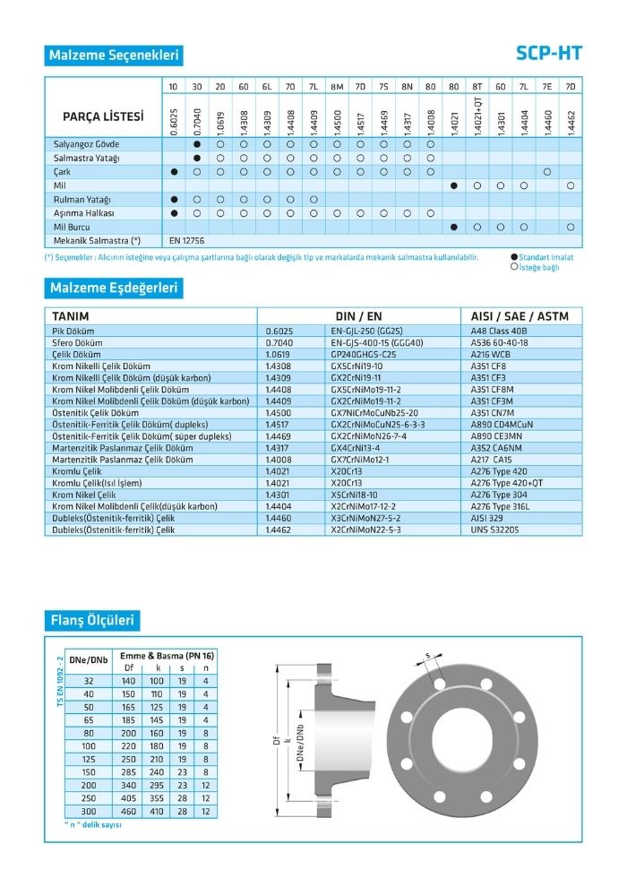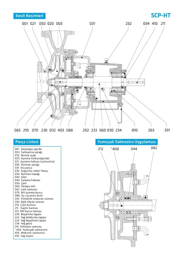 Tüm çarklar ISO 1940 sınıf 6.3’e göre dinamik veya statik olarak dengelenmiştir. Eksenel kuvvet, çark dengeleme delikleri sistemiyle dengelenir. SCP-HT tipi pompalarda standart olarak sıvı yağlı rulman sistemi kullanılır.